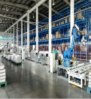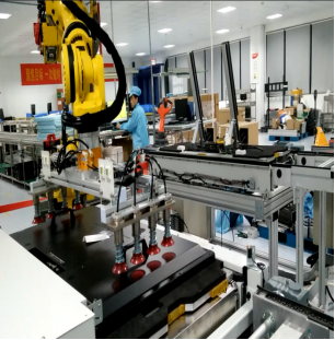 电池半成品、包辅材双深位立体库。电池包装线对电池进行机器人上料、丝印、装盒、放说明书、放配件、热缩膜、机器人码垛等作业环节。